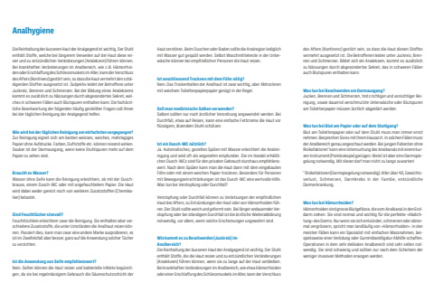 AnalhygieneDie Reinhaltung der %u00e4usseren Haut der Analgegend ist wichtig. Der Stuhl enth%u00e4lt Stoffe, welche bei l%u00e4ngerem Verweilen auf der Haut diese reizen und zu entz%u00fcndlichen Ver%u00e4nderungen (Analekzem) f%u00fchren k%u00f6nnen. Bei krankhaften Ver%u00e4nderungen im Analbereich, wie z.B. H%u00e4morrhoiden oder Erschlaffung des Schliessmuskels im Alter, kann der Verschluss des Afters (Kontinenz) gest%u00f6rt sein, so dass die Haut vermehrt den sch%u00e4digenden Stoffen ausgesetzt ist. Subjektiv leidet der Betroffene unter Juckreiz, Brennen und Schmerzen. Bei der Bildung eines Analekzems kommt es zus%u00e4tzlich zu N%u00e4ssungen durch abgesondertes Sekret, welches in schweren F%u00e4llen auch Blutspuren enthalten kann. Die fach%u00e4rztliche Beantwortung der folgenden h%u00e4ufig gestellten Fragen soll Ihnen bei der t%u00e4glichen Reinigung der Analgegend helfen.Wie wird bei der t%u00e4glichen Reinigung am einfachsten vorgegangen?Zur Reinigung eignet sich am besten weisses, weiches, mehrlagiges Papier ohne Aufdrucke. Farben, Duftstoffe etc. k%u00f6nnen reizend wirken. Sauber ist der Darmausgang, wenn keine Stuhlspuren mehr auf dem Papier zu sehen sind.Braucht es Wasser?Wasser ohne Seife kann die Reinigung erleichtern, ob mit der Duschbrause, einem Dusch-WC oder mit angefeuchtetem Papier. Die Haut wird dabei weder gereizt noch von weiteren Zusatzstoffen (Chemikalien) belastet.Sind Feuchtt%u00fccher sinnvoll?Feuchtt%u00fcchlein erleichtern zwar die Reinigung. Sie enthalten aber verschiedene Zusatzstoffe, die unter Umst%u00e4nden die Analhaut reizen k%u00f6nnen. Passiert dies, kann man zwar eine andere Marke ausprobieren, es ist im Zweifelsfall aber besser, ganz auf die Anwendung solcher T%u00fccher zu verzichten.Ist die Anwendung von Seife empfehlenswert?Nein. Seifen k%u00f6nnen die Haut reizen und bakterielle Infekte beg%u00fcnstigen, da sie bei regelm%u00e4ssigem Gebrauch die S%u00e4ureschutzschicht der Haut zerst%u00f6ren. Beim Duschen oder Baden sollte die Analregion lediglich mit Wasser gut gesp%u00fclt werden. Selbst Waschmittelreste in der Unterw%u00e4sche k%u00f6nnen bei empfindlichen Personen die Haut reizen.Ist anschliessend Trocknen mit dem F%u00f6hn n%u00f6tig?Nein. Das Trockenhalten der Analhaut ist zwar wichtig, aber Abtrocknen mit weichem Toilettenpapierpapier gen%u00fcgt in der Regel.Soll man medizinische Salben verwenden?Salben sollten nur nach %u00e4rztlicher Verordnung angewendet werden. Bei Durchfall, etwa auf Reisen, kann eine einfache Fettcreme die Haut vor fl%u00fcssigem, %u00e4tzendem Stuhl sch%u00fctzen.Ist ein Dusch-WC n%u00fctzlich?Ja. Automatisches, gezieltes Sp%u00fclen mit Wasser erleichtert die Analreinigung und wird oft als angenehm empfunden. Die im Handel erh%u00e4ltlichen Dusch-WCs sind f%u00fcr den privaten Gebrauch durchaus empfehlenswert. Nach dem Sp%u00fclen kann man die Haut dann mit dem eingebauten F%u00f6hn oder mit einem weichen Papier trocknen. Besonders f%u00fcr Personen mit Bewegungseinschr%u00e4nkungen ist das Dusch-WC eine wertvolle Hilfe.Was tun bei Verstopfung oder Durchfall?Verstopfung oder Durchfall k%u00f6nnen zu Verletzungen der empfindlichen Haut des Afters, zu Entz%u00fcndungen der Haut oder von H%u00e4morrhoiden f%u00fchren. Der Stuhl sollte weich und geformt sein. Bei l%u00e4nger andauernder Verstopfung oder bei st%u00e4ndigem Durchfall ist die %u00e4rztliche Weiterabkl%u00e4rung notwendig, vor allem, wenn solche Erscheinungen ungewohnt sind.Wie kommt es zu Beschwerden (Juckreiz) im Analbereich?Die Reinhaltung der %u00e4usseren Haut der Analgegend ist wichtig. Der Stuhl enth%u00e4lt Stoffe, die die Haut reizen und zu entz%u00fcndlichen Ver%u00e4nderungen (Analekzem) f%u00fchren k%u00f6nnen, wenn sie zu lange auf der Haut verbleiben. Bei krankhaften Ver%u00e4nderungen im Analbereich, wie etwa H%u00e4morrhoiden oder einer Erschlaffung des Schliessmuskels im Alter, kann der Verschluss des Afters (Kontinenz) gest%u00f6rt sein, so dass die Haut diesen Stoffen vermehrt ausgesetzt ist. Die Betroffenen leiden unter Juckreiz, Brennen und Schmerzen. Bildet sich ein Analekzem, kommt es zus%u00e4tzlich zu N%u00e4ssungen durch abgesondertes Sekret, das in schweren F%u00e4llen auch Blutspuren enthalten kann. Was tun bei Beschwerden am Darmausgang?Jucken, Brennen und Schmerzen, trotz richtiger und vorsichtiger Reinigung, sowie dauernd verschmutzte Unterw%u00e4sche oder Blutspuren am Toilettenpapier m%u00fcssen %u00e4rztlich abgekl%u00e4rt werden.Was tun bei Blut am Papier oder auf dem Stuhlgang?Blut am Toilettenpapier oder auf dem Stuhl muss man immer ernst nehmen. Besprechen Sie es mit Ihrem Hausarzt. In solchen F%u00e4llen muss der Analbereich genau angeschaut werden. Bei jungen Patienten ohne Risikofaktoren* kann eine Untersuchung des Analkanals mit einem kurzen Instrument (Proktoskopie) gen%u00fcgen. Meist ist aber eine Darmspiegelung notwendig. Mit dieser darf man nicht zu lange zuwarten!* Risikofaktoren (Darmspiegelung notwendig): Alter %u00fcber 40, Gewichtsverlust, Schmerzen, Darmkrebs in der Familie, entz%u00fcndliche Darmerkrankung.Was tun bei H%u00e4morrhoiden?H%u00e4morrhoiden sind grosse Blutgef%u00e4sse, die vom Analkanal in den Enddarm ziehen. Sie sind normal und wichtig f%u00fcr die perfekte %u00abAbdichtung%u00bb des Darms. Nur wenn sie sich entz%u00fcnden, schmerzen oder abnormal vergr%u00f6ssern, spricht man landl%u00e4ufig von %u00abH%u00e4morrhoiden%u00bb. In den meisten F%u00e4llen kann ein Spezialist mit einfachen Massnahmen, beispielsweise einer Ver%u00f6dung oder Gummibandligatur Abhilfe schaffen. Operationen in dem sehr delikaten Analbereich sind sehr selten notwendig. Sie sind schwierig und sollten nur nach dem Scheitern der weniger invasiven Methoden erwogen werden.