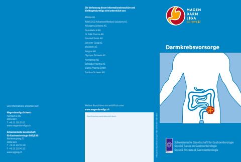 DarmkrebsvorsorgeSchweizerische Gesellschaft f%u00fcr GastroenterologieSoci%u00e9t%u00e9 Suisse de Gastroent%u00e9rologieSociet%u00e0 Svizzera di GastroenterologiaEine Informations-Brosch%u00fcre der:Magendarmliga SchweizPostfach 27053001 BernT +41 31 301 25 21www.magendarmliga.chSchweizerische Gesellschaft f%u00fcr Gastroenterologie SGG/SSGWattenwylweg 21 3006 Bern T +41 31 332 41 10F +41 31 332 41 12www.sggssg.chDiese Brosch%u00fcre wurde %u00fcberreicht durch:Die Verfassung dieser Informationsbrosch%u00fcre und die Magendarmliga wird unterst%u00fctzt von:Weitere Brosch%u00fcren sind erh%u00e4ltlich unter: www.magendarmliga.chAbbVie AGADMEDICS Advanced Medical Solutions AGAlfasigma Schweiz AGDesoMedical AGDr. Falk Pharma AGDuomed Swiss AGJanssen-Cilag AGMositech AGNorgine AGOlympus Schweiz AGPermamed AGSchwabe Pharma AGViatris Pharma GmbHZambon Schweiz AG%u00a9 Magendarmliga Schweiz, August 2025. Alle Rechte vorbehalten.